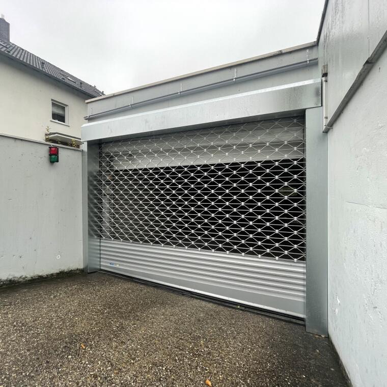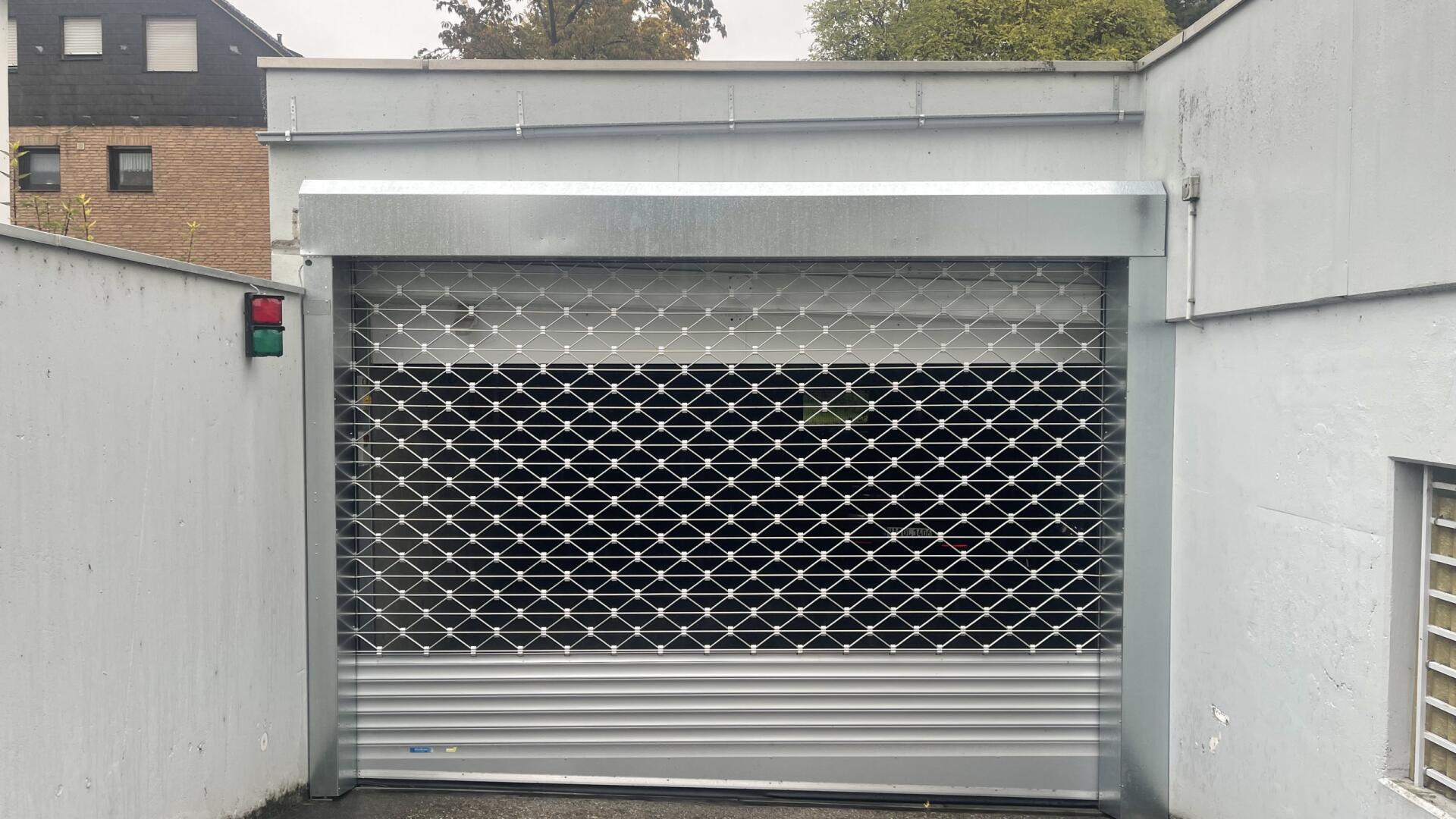 Ausführung der Toranlage als Rollgitter mit schräger Endschiene und schrägen Zargen. Marderschutz als M7 Rolltorlamelle in unserer Standardfarbe RAL 9006. Ampel rot /grün innen und außen. Ansteuerung über Funkhandsender und Seilzugschalter/ Notbedienung über Funktion 2. Rettungsweg.